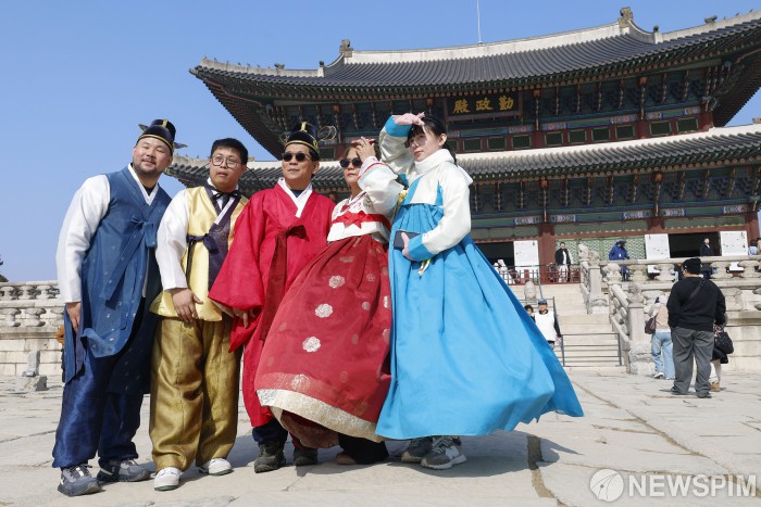 [서울=뉴스핌] 류기찬 기자 = 설 연휴를 맞아 주요 궁궐이 무료로 개방한 15일 오후 서울 종로구 경복궁을 찾은 외국인 관광객들이 기념촬영을 하고 있다. 2026.02.15 ryuchan0925@newspim.com