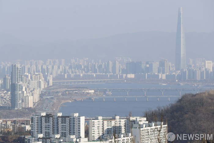 [서울=뉴스핌] 류기찬 기자 = 초미세먼지 농도가 나쁨 수준을 보인 15일 오후 서울 중구 남산에서 바라본 도심이 뿌옇다. 2026.02.15 ryuchan0925@newspim.com