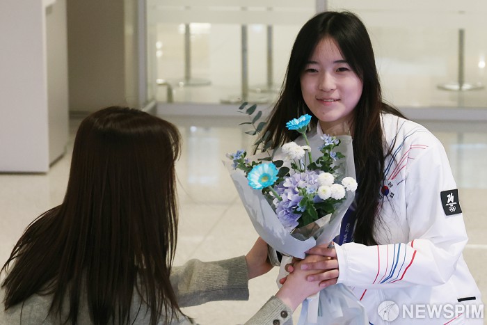 [영종도=뉴스핌] 이형석 기자 = 2026 밀라노·코르티나 동계올림픽 스노보드 하프파이프 금메달리스트 최가온이 16일 오후 인천국제공항을 통해 귀국하며 꽃다발을 받고 있다. 2026.02.16 leehs@newspim.com