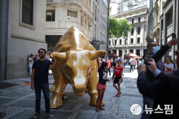 브라질 상파울로의 B3 증권거래소 앞에 설치된 황금 황소상 앞에서 16일(현지시간) 사람들이 기념 사진을 찍고 있다. [사진=로이터 뉴스핌]