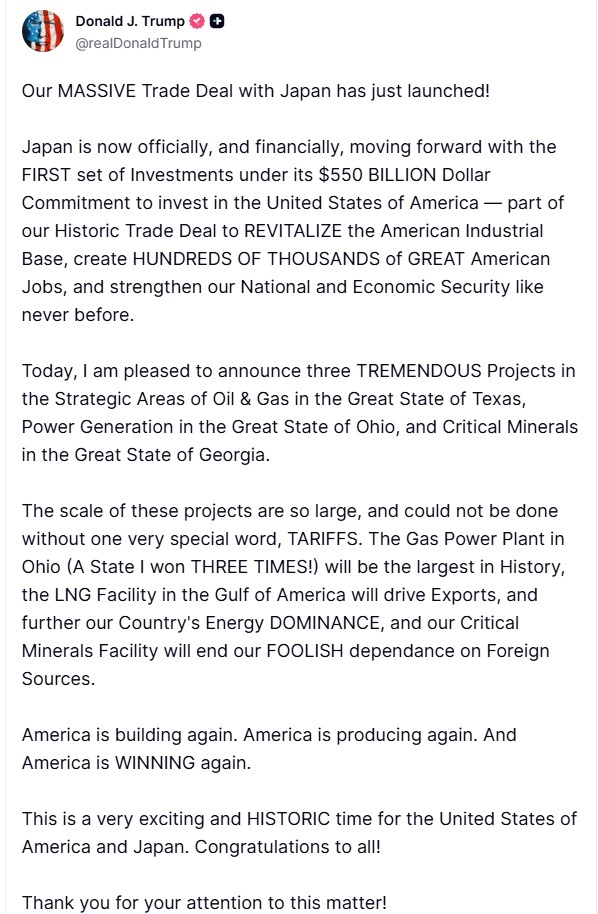 트럼프 대통령은 17일(현지시각) 자신의 소셜미디어 트루스소셜을 통해 "우리의 거대한 일본 무역협정이 이제 시작됐다"면서 "일본은 이제 공식적으로, 그리고 재정적으로, 미국에 대한 5,500억 달러 투자 약속의 첫 번째 투자 집행에 나선다"고 밝혔다.