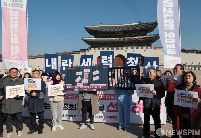 [서울=뉴스핌] 이길동 기자 = 전국민중행동 관계자들이 19일 오전 서울 종로구 광화문 월대 앞에서 열린 내란 수괴 윤석열의 엄중한 처벌을 촉구하는 기자회견에서 구호를 외치고 있다. 2026.02.19 gdlee@newspim.com
