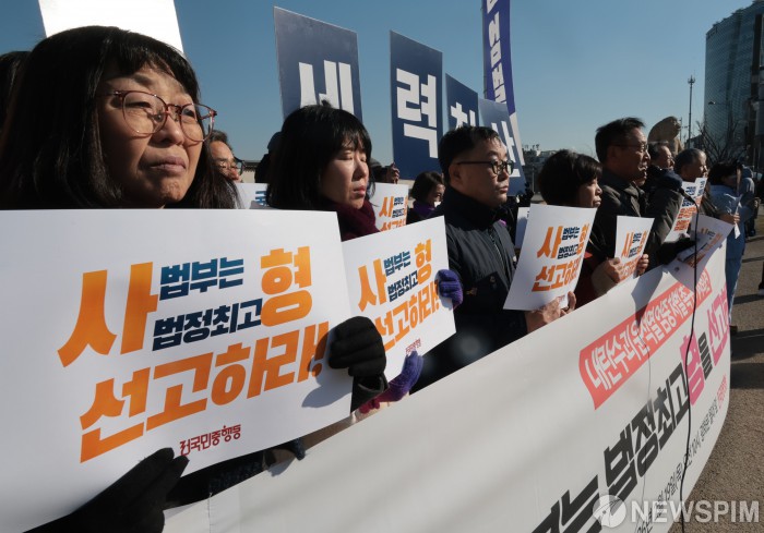 [서울=뉴스핌] 이길동 기자 = 전국민중행동 관계자들이 19일 오전 서울 종로구 광화문 월대 앞에서 내란 수괴 윤석열의 엄중한 처벌을 촉구하는 기자회견을 하고 있다. 2026.02.19 gdlee@newspim.com