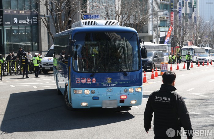[서울=뉴스핌] 정일구 기자 = 내란 우두머리 혐의로 기소된 윤석열 전 대통령의 1심 선고기일인 19일 오후 서울 서초구 서울중앙지방법원에서 윤 전 대통령이 탄 호송차가 법원으로 들어서고 있다. 2026.02.19 mironj19@newspim.com