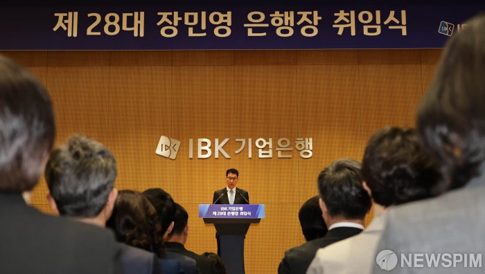 [서울=뉴스핌] 양윤모 기자= 장민영 제28대 IBK기업은행장이 20일 오전 서울 중구 을지로 본점 15층 대강당에서 개최된 취임식에 참석해 취임사를 하고 있다. 장 은행장과 노조는 시간외수당 미지급 문제를 13일 ‘미지급 수당 문제 정상화’에 대한 선언적 합의를 담은 교섭안에 서명했으며 한달만에 취임식을 개최했다. 2026.02.20 yym58@newspim.com