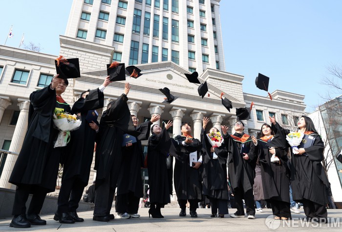 [서울=뉴스핌] 정일구 기자 = 20일 서울 동대문구 한국외국어대학교에서 열린 2026년 전기 학위수여식에서 졸업생들이 학사모를 던지고 있다. 2026.02.20 mironj19@newspim.com