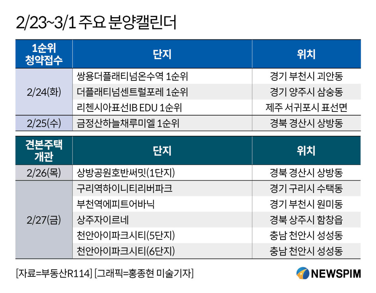 22일 부동산R114에 따르면 이번 주에는 경기 부천시 괴안동 '쌍용더플래티넘온수역', 경기 양주시 삼숭동 '더플래티넘센트럴포레', 부산 금정구 장전동 '금정산하늘채루미엘' 등에서 청약을 진행한다.