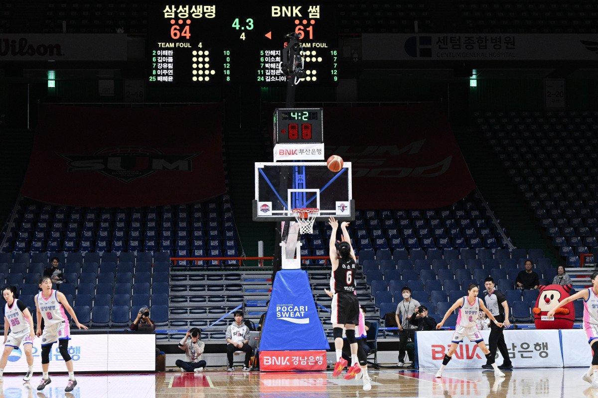 삼성생명은 21일 부산 사직체육관에서 열린 BNK금융 2025~2026 여자프로농구 BNK와의 원정경기에서 연장전 끝에 76-73으로 승리했다. 13승13패를 기록하며 단독 3위가 됐다. BNK는 12승14패를 기록하며 아산 우리은행(12승13패)에 이어 5위로 떨어졌다.