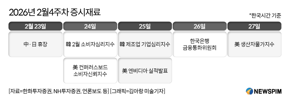 국내 통화정책 이벤트도 대기 중이다. 26일 열리는 한국은행 금융통화위원회에서는 기준금리 2.50% 동결이 유력하다. 이상준 NH투자증권 연구원 "1월 소비자물가 상승률이 2.0%로 둔화됐지만 환율 변동성과 주택가격 흐름을 감안하면 한국은행은 신중한 스탠스를 유지할 가능성이 높다"며 "환율이 수입물가에 미치는 상방 압력을 경계할 필요가 있다"고 분석했다.