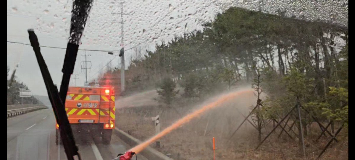 특히 산불 발생지 인근에 국가기간시설인 한국석유공사 석유비축기지가 위치해 있어, 재발화로 인한 피해를 사전에 차단하기 위해 다목적 산불진화차량으로 리타던트를 살포하는 선제적 조치를 취했다.