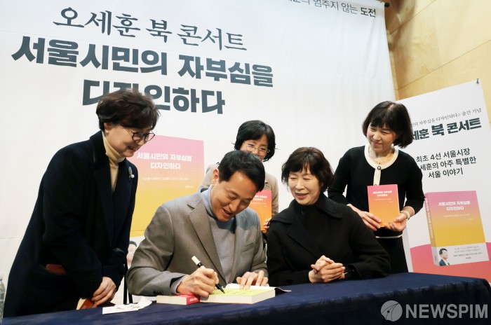 [서울=뉴스핌] 이길동 기자 = 오세훈 서울시장이 22일 오전 서울 마포구 청년문화공간 JU에서 열린 '서울시민의 자부심을 디자인하다' 북 콘서트에서 시민들에게 사인을 해주고 있다. 2026.02.22 gdlee@newspim.com