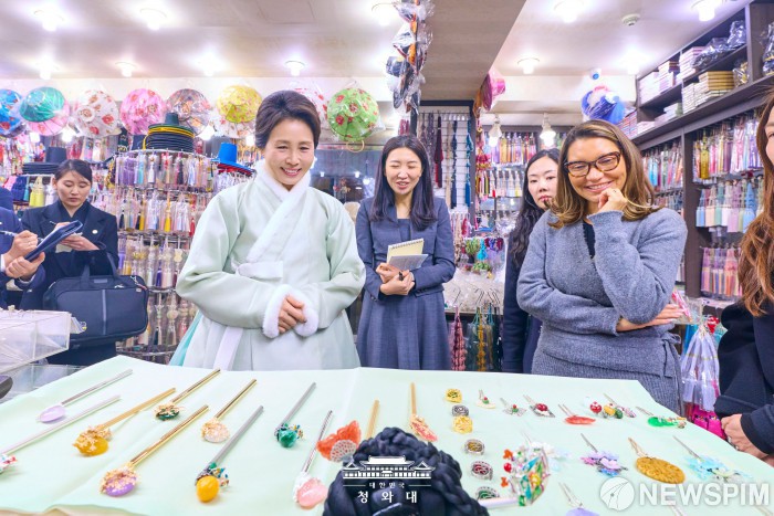 [서울=뉴스핌] 이재명 대통령의 부인 김혜경 여사가 지난 21일 서울 종로구 광장시장에서 브라질 룰라 대통령의 배우자 호잔젤라 다시우바 여사와 한복 상점을 둘러보고 있다. [사진=청와대] 2026.02.22 photo@newspim.com