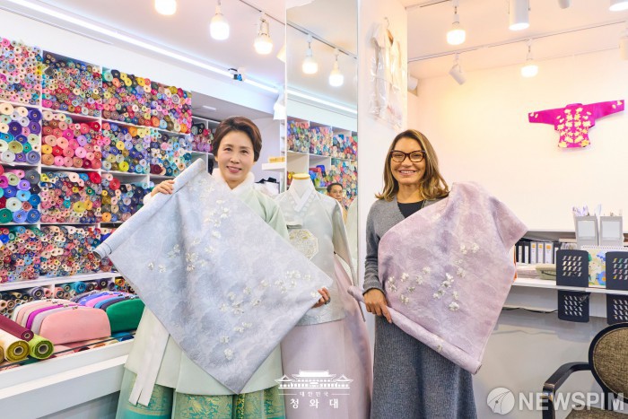 [서울=뉴스핌] 이재명 대통령의 부인 김혜경 여사가 지난 21일 서울 종로구 광장시장에서 브라질 룰라 대통령의 배우자 호잔젤라 다시우바 여사와 한복 상점을 둘러보고 있다. [사진=청와대] 2026.02.22 photo@newspim.com