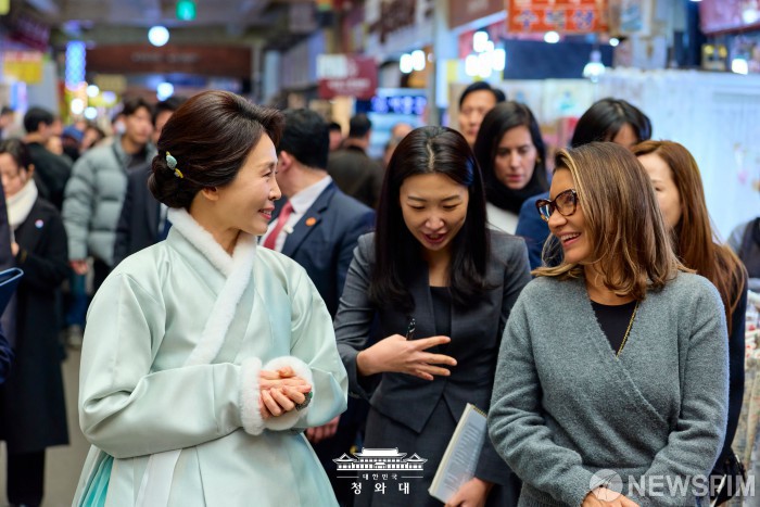 [서울=뉴스핌] 이재명 대통령의 부인 김혜경 여사가 지난 21일 서울 종로구 광장시장에서 브라질 룰라 대통령의 배우자 호잔젤라 다시우바 여사와 대화를 나누고 있다. [사진=청와대] 2026.02.22 photo@newspim.com
