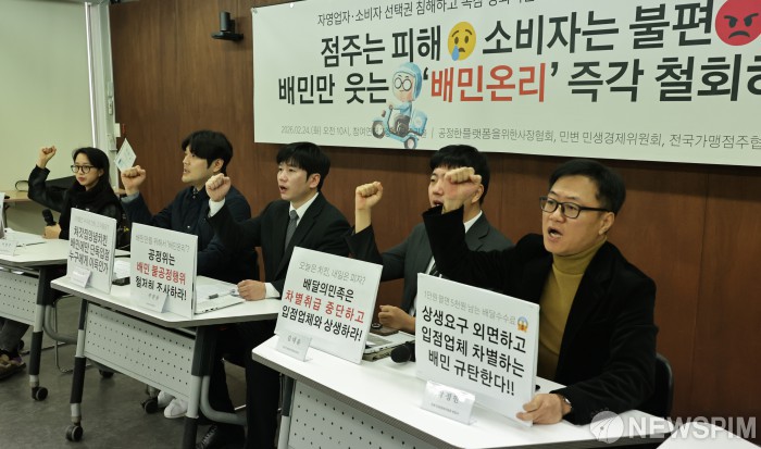 [서울=뉴스핌] 양윤모 기자= 민변과 참여연대가 24일 오전 참여연대 아름드리홀에서 처갓집양념치킨의 점주·소비자 선택권 침해하고 독점 강화하는 ‘배민온리’의 공정위 신고 기자회견을 서울 종로구 참여연대 아름드리홀에서 개최 했다. 2026.02.24 yym58@newspim.com