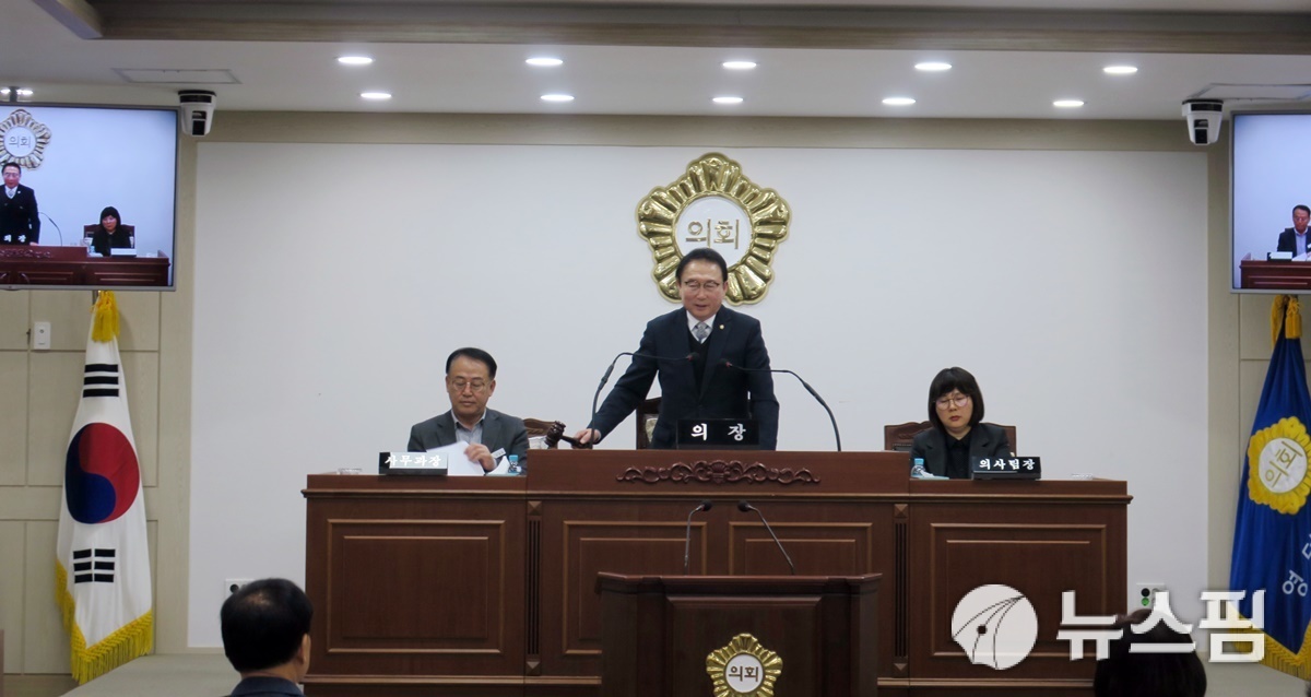 [영덕=뉴스핌] 남효선 기자 = 24일 오전 경북 영덕군의회 본회의장에서 재개된 '제320회 임시회'에서 김성호 군의장이 '신규 원자력발전소 건설 후보지 유치 신청 동의안(신규원전유치동의안)' 가결을 선포하고 있다. 이날 영덕군의회는 영덕군 집행부에서 제출된 '신규 원자력발전소 건설 후보지 유치 신청 동의안' 심의에 들어가 군의원 7명 전원 '찬성'으로 해당 동의안을 가결했다. 이 과정에서 김성호 의장은 해당 동의안에 대한 '반대 토론' 여부를 묻고 '반대 토론' 제기가 없어 '전원 찬성'으로 의결을 공표했다. 영덕군의회가 '신규 원전 유치 동의안'을 만장일치로 가결함에 따라 영덕군의 '신규 원전 2기(2.8GW)' 유치 추진에 속도를 낼 것으로 보인다. 앞서 영덕군은 '신규 원전 2기 유치 신청'을 위한 군민 여론조사를 거쳐 지난 13일 '신규 원자력발전소 건설 후보지 유치 신청 동의안'을 군의회에 제출했다.2026.02.24 nulcheon@newspim.com