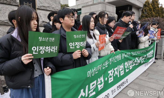 [서울=뉴스핌] 양윤모 기자= 미성년자의 신문·정기간행물 등록금지 헌법소원 청구 기자회견이 24일 오후 서울 종로구 헌법재판소 앞에서 '청소년 독립신문 도끼풀' 주최로 열렸다. 2026.02.24 yym58@newspim.com