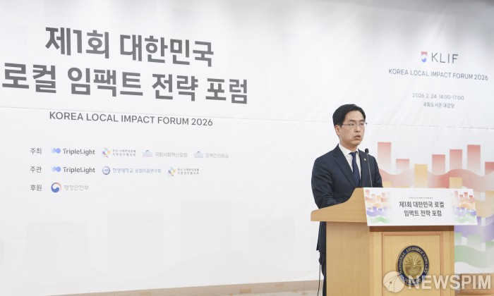 [서울=뉴스핌] 김민재 행정안전부 차관이 24일 오후 서울 영등포구 국회도서관 대강당에서 열린 ‘제1회 대한민국 로컬임팩트 전략포럼’에 참석해 인사말을 하고 있다.[사진=행정안전부] 2026.02.24 photo@newspim.com