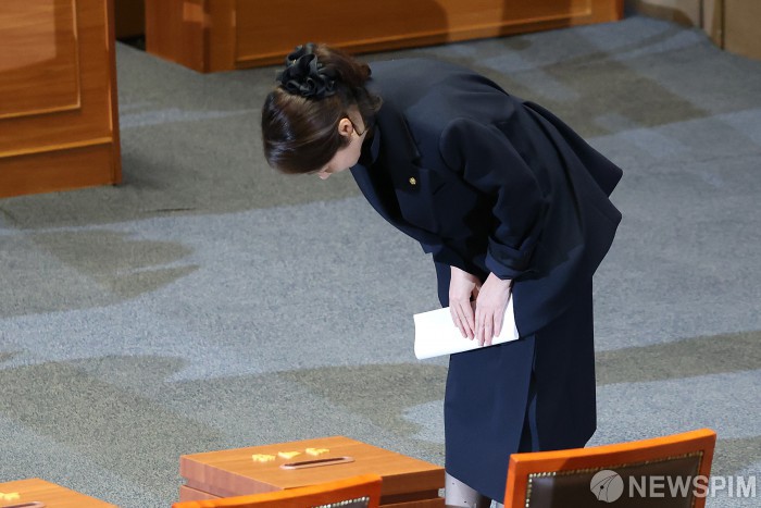 [서울=뉴스핌] 정일구 기자 = 강선우 무소속 의원이 24일 오후 서울 여의도 국회에서 열린 제432회국회(임시회) 제8차 본회의에서 체포동의안 표결을 앞두고 신상 발언에 앞서 인사하고 있다. 2026.02.24 mironj19@newspim.com