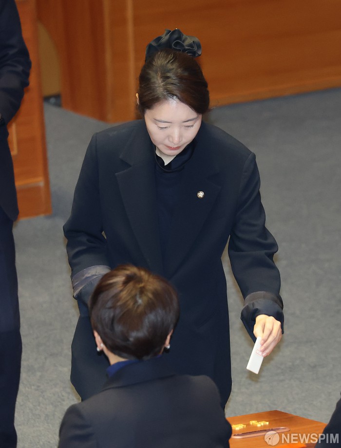[서울=뉴스핌] 정일구 기자 = 강선우 무소속 의원이 24일 오후 서울 여의도 국회에서 열린 제432회국회(임시회) 제8차 본회의에서 자신에 대한 체포동의안 투표를 하고 있다. 2026.02.24 mironj19@newspim.com