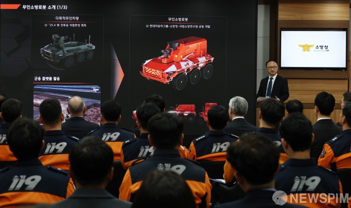 [남양주=뉴스핌] 김현우 기자 = 김석환 현대로템 AX추진센터장이 24일 오후 경기도 남양주 수도권119특수구조대에서 열린 현대자동차그룹-소방청 무인소방로봇 기증식에서 소방로봇을 설명하고 있다. 2026.02.24 khwphoto@newspim.com