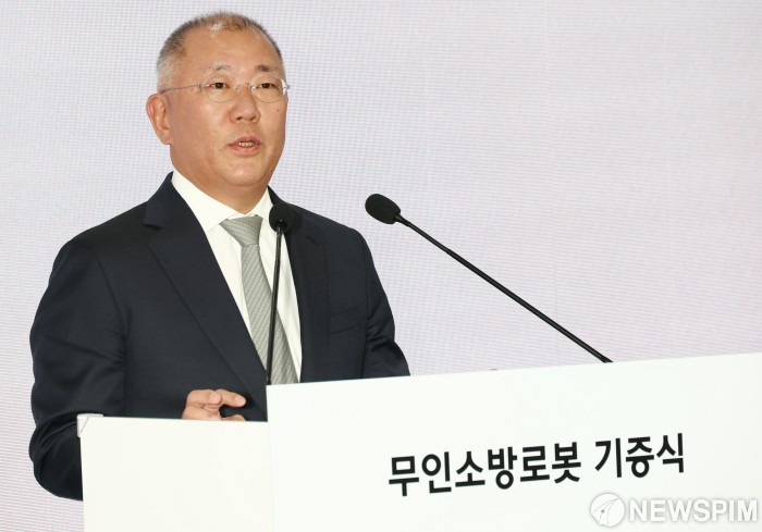 [남양주=뉴스핌] 김현우 기자 = 정의선 현대차그룹 회장이 24일 오후 경기도 남양주 수도권119특수구조대에서 열린 현대자동차그룹-소방청 무인소방로봇 기증식에서 인사말을 하고 있다. 2026.02.24 khwphoto@newspim.com