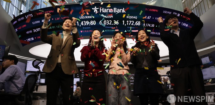[서울=뉴스핌] 양윤모 기자 = 25일 오전 1980년 코스피 시장이 열린지 46년 만에 사상 처음으로 장초 6000선을 돌파하자 서울 중구 하나은행본점 딜링룸에서 직원들이 축하 세레머니를 하고 있다. 2026.02.25 yym58@newspim.com