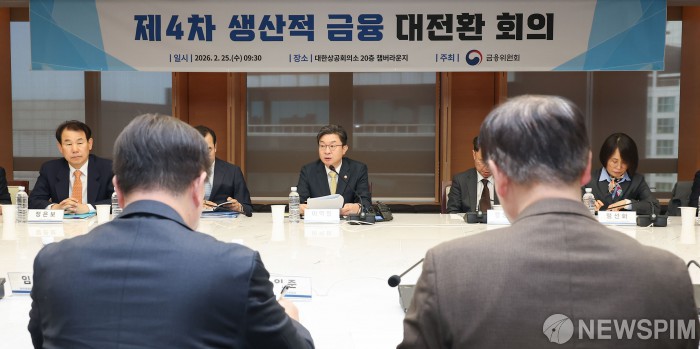 [서울=뉴스핌] 류기찬 기자 = 이억원 금융위원장이 25일 오전 서울 중구 대한상공회의소 챔버라운지에서 열린 ‘녹색전환(GX) 지원을 위한 제 4차 생산적금융 대전환 회의’에서 모두 발언을 하고 있다. 2026.02.25 ryuchan0925@newspim.com