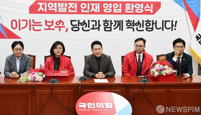 [서울=뉴스핌] 윤창빈 기자 = 장동혁 국민의힘 대표가 25일 서울 여의도 국회에서 열린 지역발전 인재 영입 환영식에서 모두발언을 하고 있다. 2026.02.25 pangbin@newspim.com