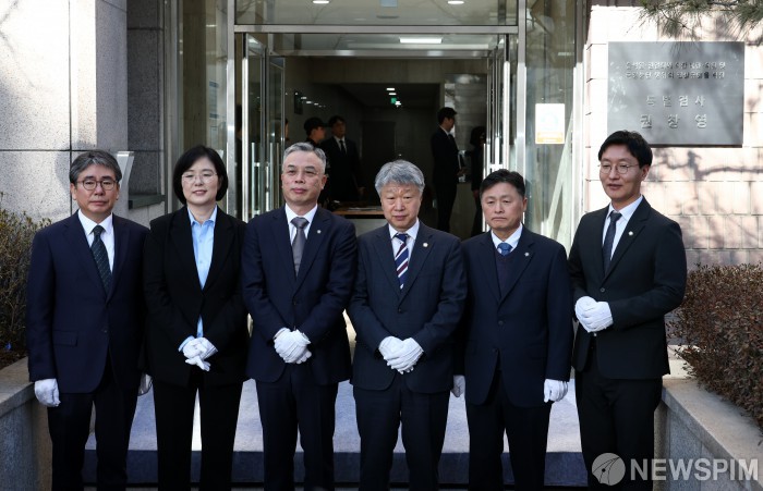 [과천=뉴스핌] 김현우 기자 = 권창영 2차 종합특검팀 특별검사(왼쪽 세번째)를 비롯한 특검보 등 직원들이 25일 오전 경기 과천시 2차 종합특검팀 사무실 앞에서 현판식을 열고 있다. 2026.02.25 khwphoto@newspim.com