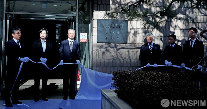 [과천=뉴스핌] 김현우 기자 = 권창영 2차 종합특검팀 특별검사(왼쪽 세번째)를 비롯한 특검보 등 직원들이 25일 오전 경기 과천시 2차 종합특검팀 사무실 앞에서 현판식을 열고 있다. 2026.02.25 khwphoto@newspim.com