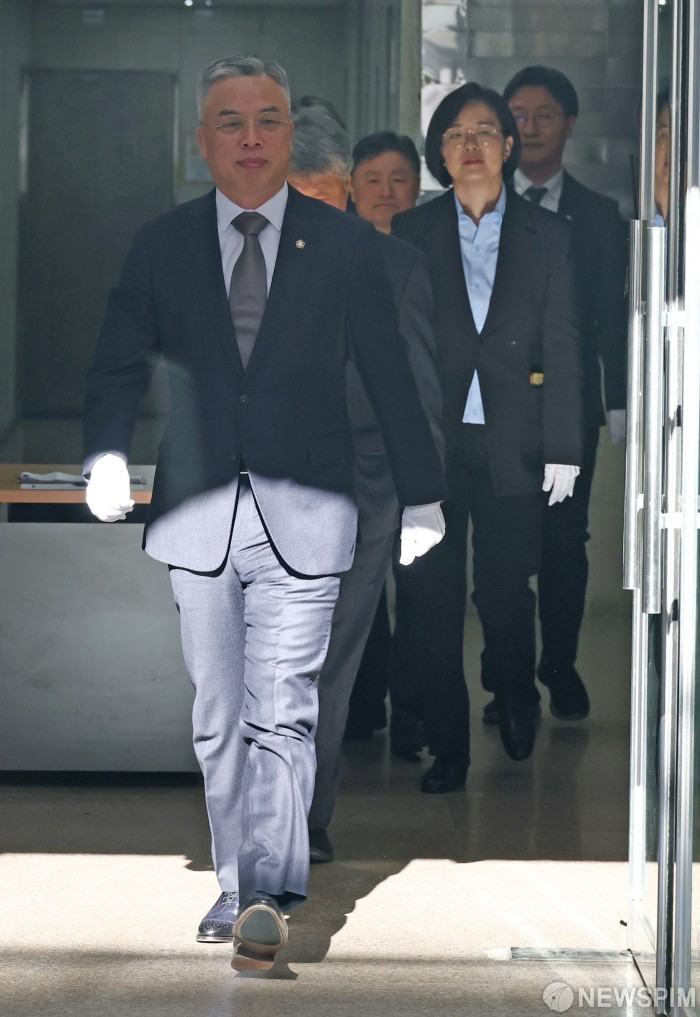[과천=뉴스핌] 김현우 기자 = 권창영 2차 종합특검팀 특별검사를 비롯한 특검보 등 직원들이 25일 오전 경기 과천시 2차 종합특검팀 사무실 앞에서 열린 현판식에 참석하고 있다. 2026.02.25 khwphoto@newspim.com