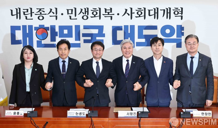 [서울=뉴스핌] 윤창빈 기자 = 한병도 더불어민주당 원내대표를 비롯한 개혁진보4당 원내대표가 25일 서울 여의도 국회에서 열린 민주당-개혁진보4당 정치개혁 간담회에서 기념촬영을 하고 있다. 왼쪽부터 용혜인 기본소득당 원내대표, 윤종오 진보당 원내대표, 한 원내대표, 서왕진 조국혁신당 원내대표, 한창민 사회민주당 원내대표, 이연희 더불어민주당 전략기획위원장. 2026.02.25 pangbin@newspim.com