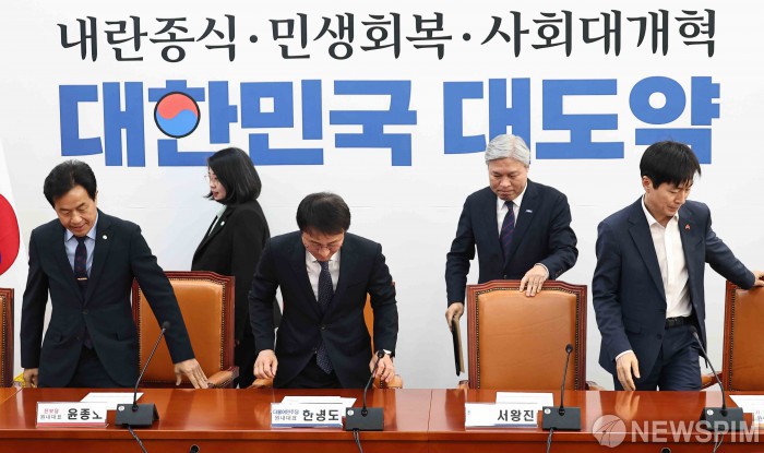 [서울=뉴스핌] 윤창빈 기자 = 한병도 더불어민주당 원내대표를 비롯한 개혁진보4당 원내대표가 25일 서울 여의도 국회에서 열린 민주당-개혁진보4당 정치개혁 간담회에 참석하고 있다. 2026.02.25 pangbin@newspim.com