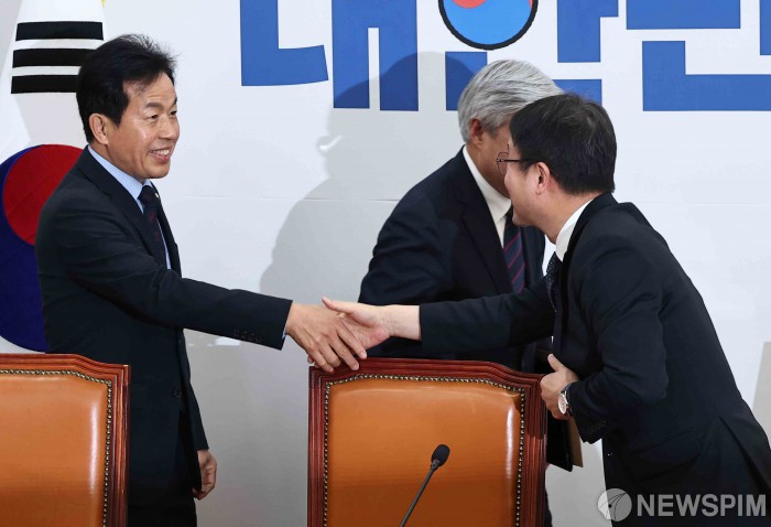 [서울=뉴스핌] 윤창빈 기자 = 한병도 더불어민주당 원내대표가 25일 서울 여의도 국회에서 열린 민주당-개혁진보4당 정치개혁 간담회에서 윤종오 진보당 원내대표와 악수하고 있다. 2026.02.25 pangbin@newspim.com