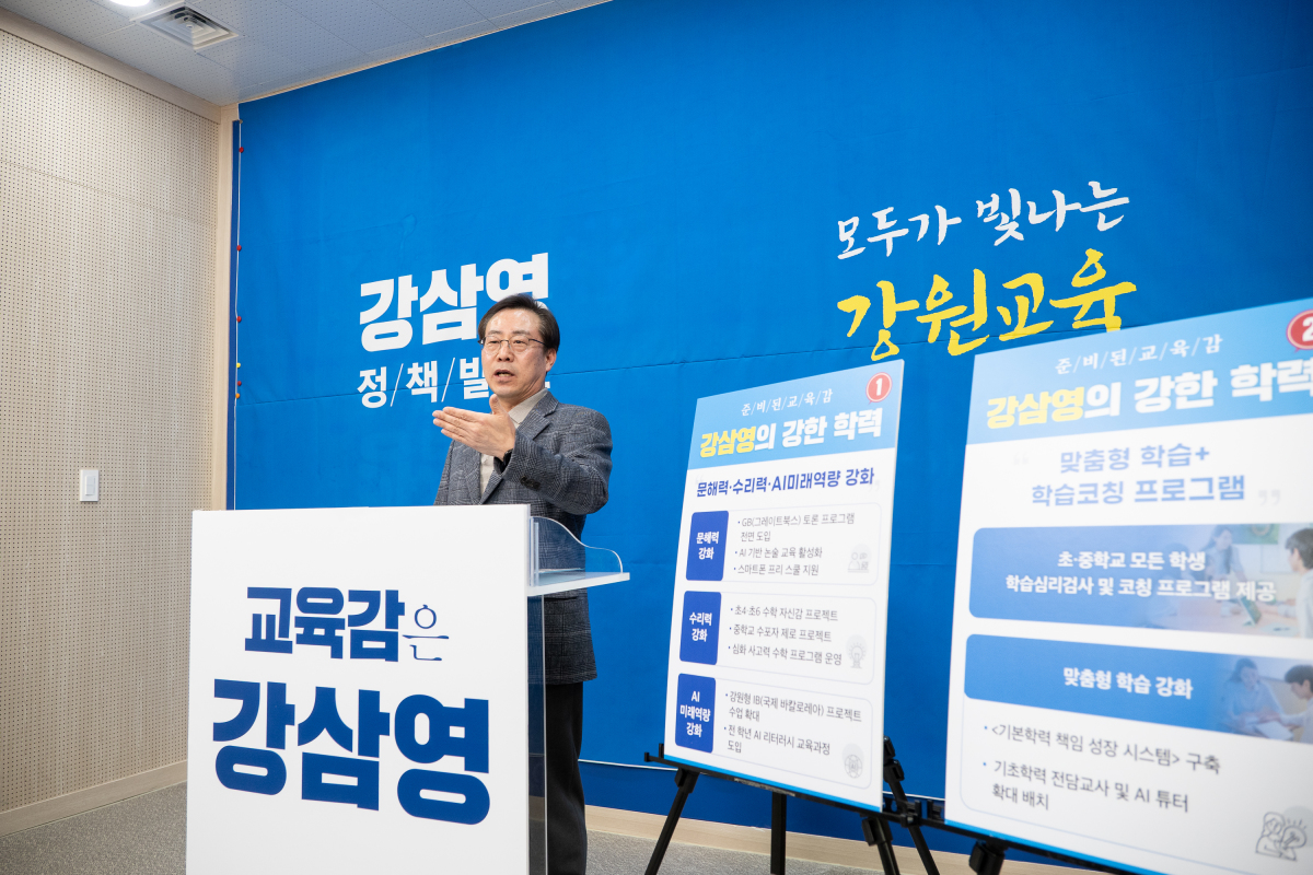 강삼영 예비후보는 "강원 어디에서 태어나도 '강한 학력'으로 자신의 길을 개척할 수 있어야 한다"며 "문해력과 수리력, 그리고 AI 시대에 필요한 미래역량을 골고루 키워 수포자 없는 학교, 누구나 성장하는 강원교육을 만들겠다"고 말했다.