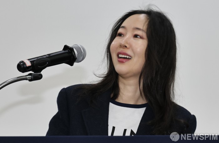 [서울=뉴스핌] 양윤모 기자= 민희진 오케이 레코즈 대표가 25일 오후 서울 종로구 관철동 교원 챌린지홀에서 하이브와의 "255억원을 내려놓는대신 현재 진행중인 모든 소송과 분쟁을 중단하라"는 기자회견을 하고 있다. 서울중앙지법은 지난 12일 민 대표 등 3명이 하이브를 상대로 제기한 풋옵션 행사에 따른 주식매매대금 청구 소송을 인용하고, 하이브가 민 전 대표에게 255억 원을 지급하라고 명령했으며 하이브는 항소했다. 2026.02.25 yym58@newspim.com