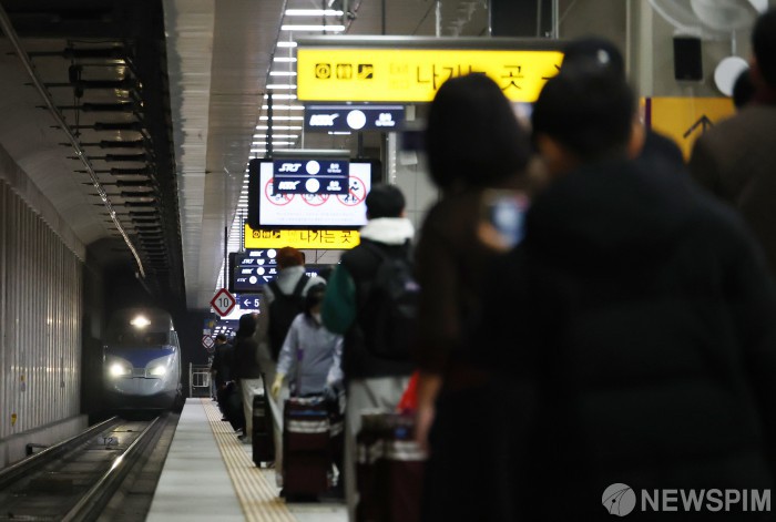 [서울=뉴스핌] 김현우 기자 = 25일 오후 서울 강남구 수서역에 부산발 KTX가 승강장에 들어서고 있다. KTX는 수서역∼부산역을, SRT는 서울역∼부산역을 매일 각 1회 왕복 운행한다. 2026.02.25 khwphoto@newspim.com