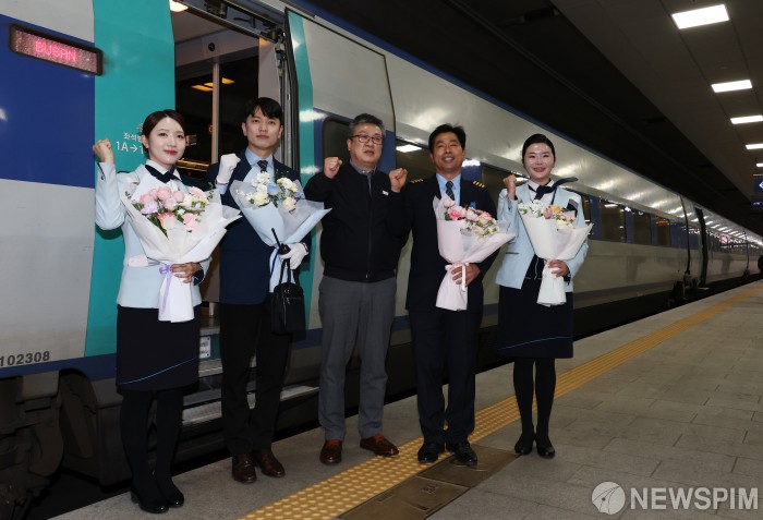 [서울=뉴스핌] 김현우 기자 = 김현아 승무원(왼쪽부터), 김필종 KTX 열차 팀장, 홍승표 코레일 사장 직무대행, 이성민 KTX 기장, 김도희 승무원이 25일 오후 서울 강남구 수서역 부산행 KTX 출발에 앞서 기념 촬영을 하고 있다. KTX는 수서역∼부산역을, SRT는 서울역∼부산역을 매일 각 1회 왕복 운행한다. 2026.02.25 khwphoto@newspim.com