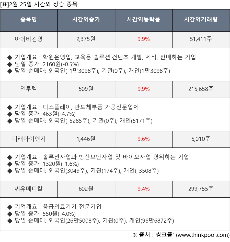 [서울=뉴스핌] 로보뉴스 = 2월 25일, 인공지능 투자비서 ‘AI라씨로’가 아이비김영(339950), 엔투텍(227950) 등 시간외 단일가 매매 상승률 상위 종목들에 대한 최근 동향을 분석했다.