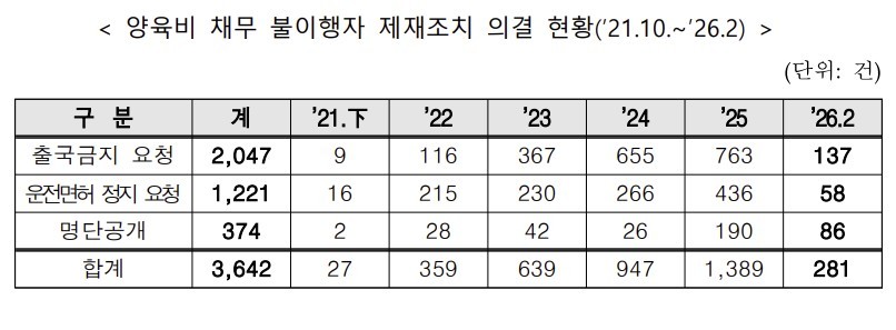 세부적으로 보면 출국금지 요청은 2021년 하반기 9건에서 ▲2022년 116건 ▲2023년 367건 ▲2024년 655건  ▲2025년 763건으로 늘었고, 올해 2월까지 137건이 의결됐다. 운전면허 정지 요청은 ▲2021년 하반기 16건 ▲2022년 215건 ▲2023년 230건 ▲2024년 266건 ▲2025년 436건 ▲올해 2월까지 58건이었다. 명단공개는 ▲2021년 하반기 2건 ▲2022년 28건 ▲2023년 42건 ▲2024년 26건 ▲2025년 190건 ▲올해 2월까지 86건으로 나타났다.