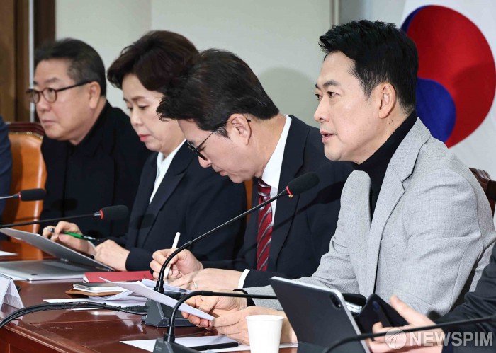 [서울=뉴스핌] 윤창빈 기자 = 장동혁 국민의힘 대표가 26일 오전 서울 여의도 국회에서 열린 최고위원회의에서 모두발언을 하고 있다. 2026.02.26 pangbin@newspim.com