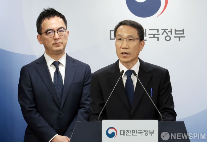 [서울=뉴스핌] 이길동 기자 = 유재성 경찰청장대행(오른쪽)과 구자현 검찰총장대행이 26일 서울 종로구 정부서울청사에서 AI 악용 등 가짜뉴스 엄정 대응을 위한 검경 합동 담화문 발표를 하고 있다. 2026.02.26 gdlee@newspim.com