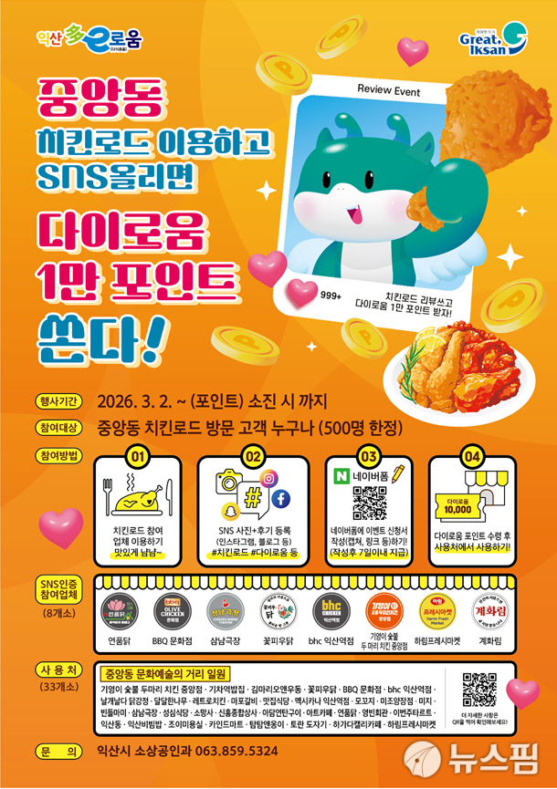 [익산=뉴스핌] 이백수 기자 = 전북 익산시가 중앙동 치킨로드 방문을 유도하고 다이로움 혜택을 제공하는 참여형 행사를 마련했다고 26일 밝혔다.