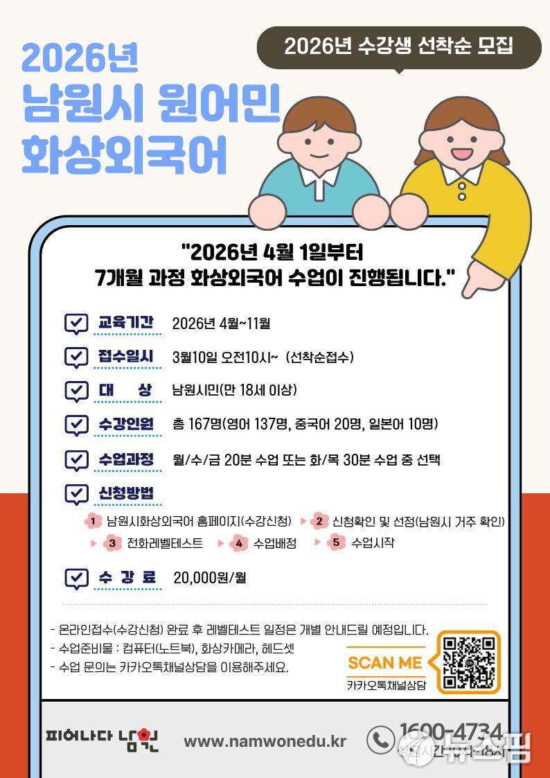 모집 인원은 총 167명으로, 영어 142명, 중국어 20명, 일본어 10명이다. 참여 희망자는 3월 10일 오전 10시부터 남원시 화상외국어 홈페이지를 통해 신청하면 된다. 정원 마감 시까지 접수 순으로 선발한다.