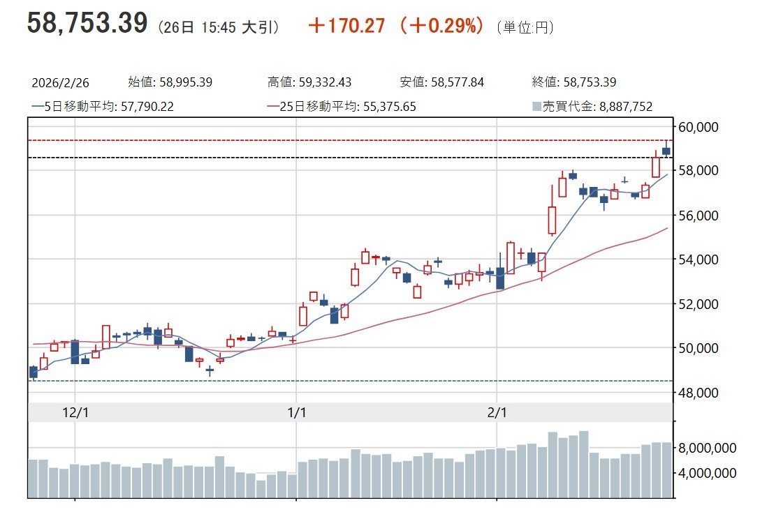 장중 한때 거래시간 기준 처음으로 5만9000엔대에 올라 상승폭이 700엔을 넘기도 했다. 다만 이후 단기 과열 경계로 차익실현 매물이 늘어나며 오후에는 소폭 하락 전환하는 장면도 있었다.