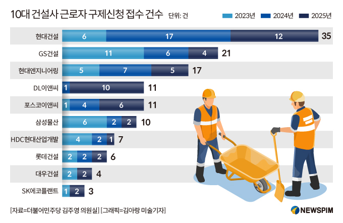 27일 더불어민주당 김주영 의원실이 고용노동부로부터 제출받은 자료에 따르면, 2023년부터 2025년까지 10대 건설사(삼성물산·현대건설·대우건설·DL이앤씨·GS건설·현대엔지니어링·포스코이앤씨·롯데건설·SK에코플랜트·HDC현대산업개발)와 관련해 전국 노동위원회에 접수된 근로자 구제신청은 총 125건이다. 2023년 38건, 2024년 41건, 2025년 46건으로 증가세다.