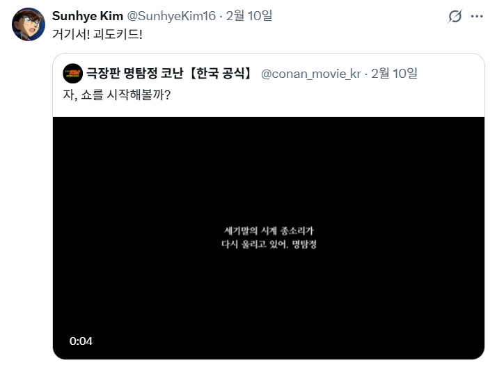 국내 괴도 키드 목소리를 담당하는 신용우 성우의 음성이 담긴 티징 영상이 공개되고 온라인상에서는 "사람 꼬시는데 9초면 충분하구나…"(X, ja****), "코난 극장판 황금기의 시작"(인스타그램, no****), "세기말의 마술사 브금 황홀하고 마법 부리는 느낌 들어서 진짜 진짜 좋은데 이걸 영화관에서 들을 수 있다니... 눈물 날 것 같음 벌써 심장 뜀"(X, tt****), "세기말의 마술사 = 명탐정 코난 배 1등 미슐랭 극장판"(X, ab****) 등의 반응과 더불어 누적 조회수 400만을 넘기며 압도적인 인기를 입증했다.