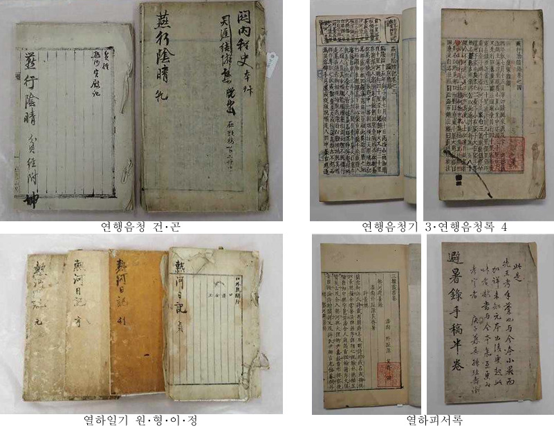 따라서 이 10종 20책 중에 박지원의 친필 고본으로서, 정본에 존재하지 않는 서학 관련 용어와 새로운 내용이 수록된 연행음청 건·곤(2책), 가장 초기 고본의 모습을 보이는 연행음청록4·연행음청기3(1책), 서문과 단락을 갖춘 고본 열하일기 원·형·이·정(4책), 정본에 없는 내용을 다수 수록하고 있는 열하피서록(1책) 등 4종 8책의 자료가 보물로 지정됐다.
