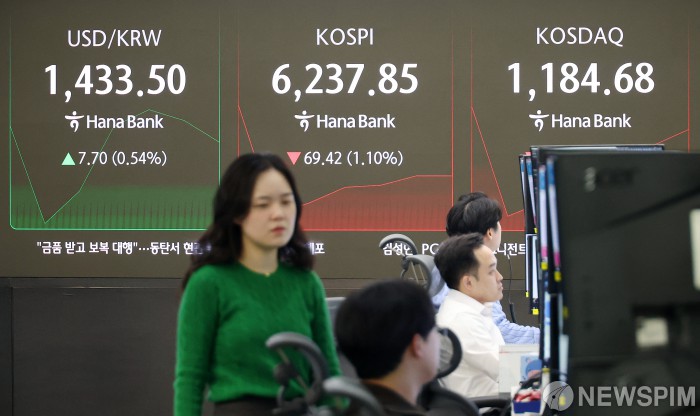 [서울=뉴스핌] 정일구 기자 = 27일 코스피 지수가 전 거래일보다 109.78포인트(1.74%) 하락한 6197.49에 출발했다. 코스닥 지수는 전 거래일보다 12.75포인트(1.07%) 내린 1175.40에 시작했다. 서울 외환시장에서 달러/원 환율은 전 거래일 주간거래 종가보다 6.4원 오른 1432.2원에 개장했다. 이날 오전 서울 중구 하나은행 딜링룸에서 딜러들이 업무를 보고 있다. 2026.02.27 mironj19@newspim.com